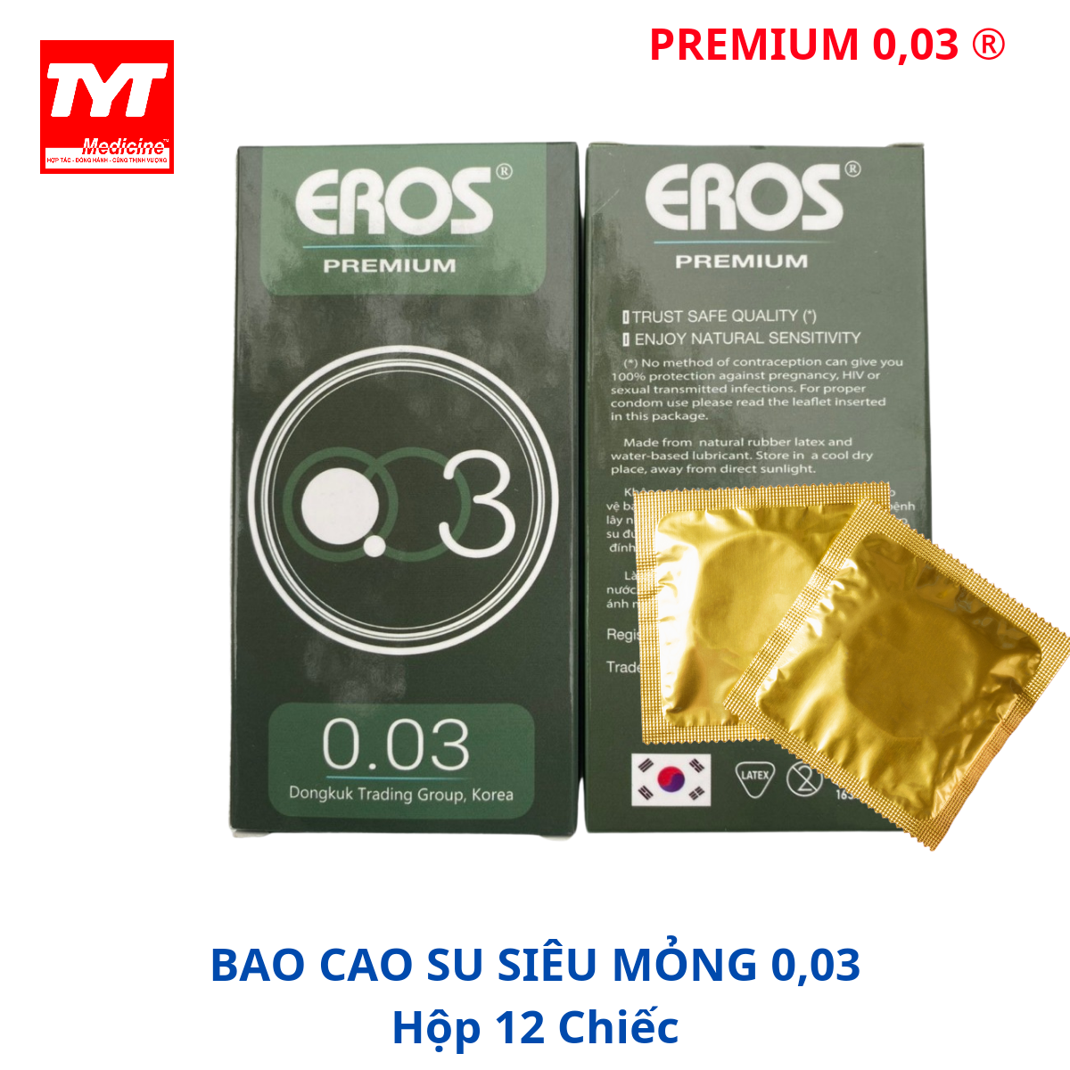 Bao cao su Eros Premium 0,03- BCS siêu mỏng trơn-Hộp 12 chiếc
