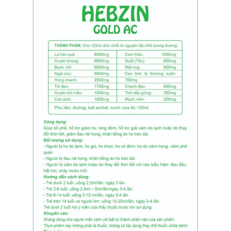 Siro Ho Cao cấp Hebzin Gold AC-Hộp 1 Lọ 125ml công hiệu cao